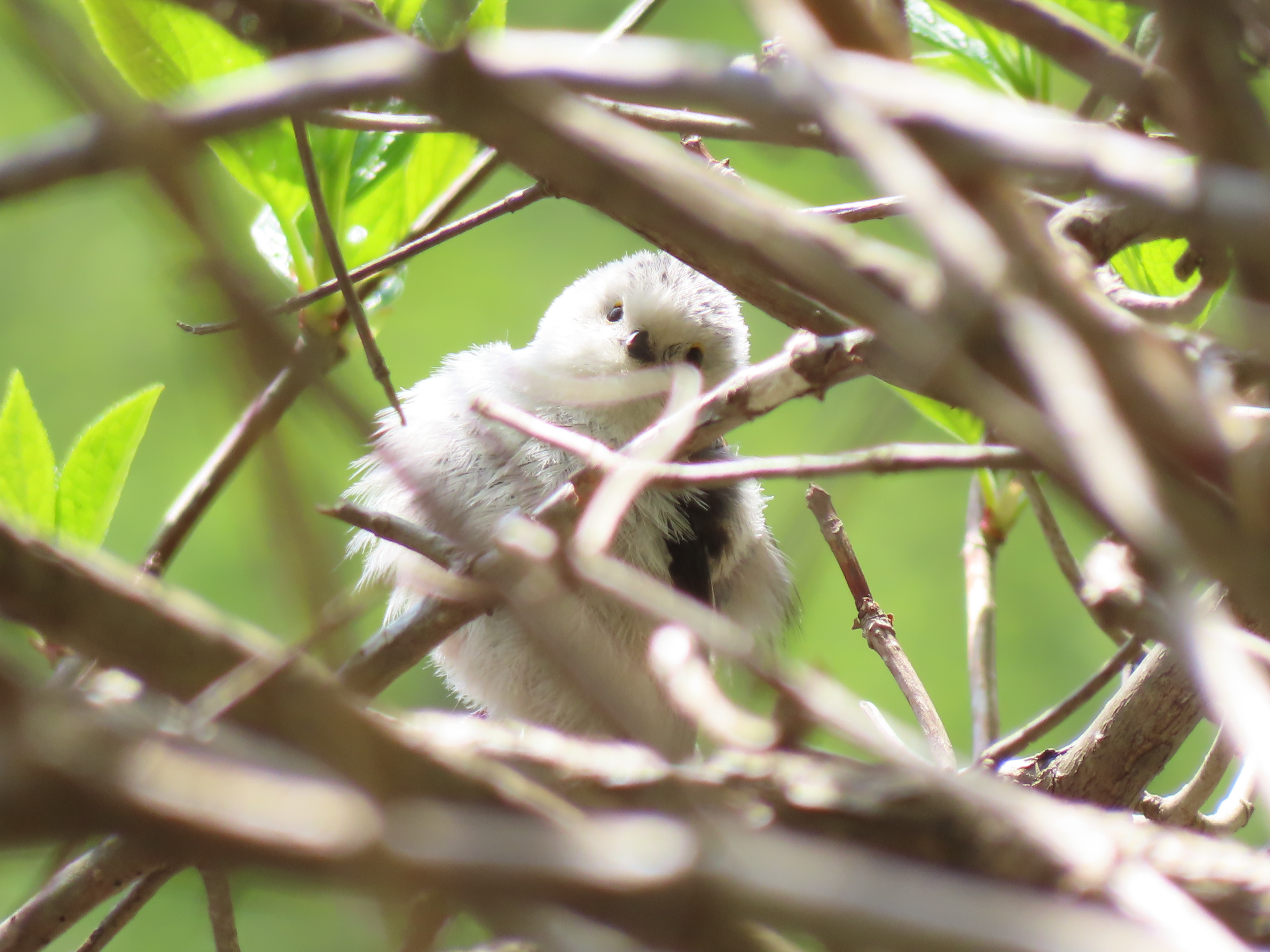 草木の緑が濃い季節にシマエナガを発見することは困難ですが、幸運にも撮影者がカメラに収めることができました。草や葉が枯れる秋から冬のほうが観察しやすいでしょう。