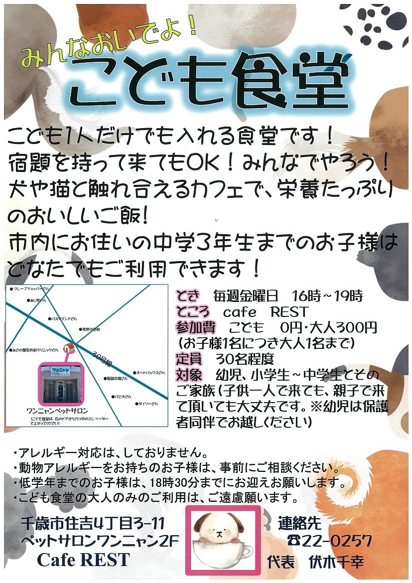 - 開催場所…千歳市住吉4丁目3番11号(「ペットサロンワンニャン」2階「CafeREST」内)